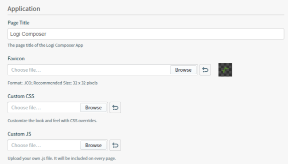 You can customize the Composer application title and favicon. You can also upload a custom .css to modify the default Composer skin or a custom JavaScript (.js) file to include on every page.