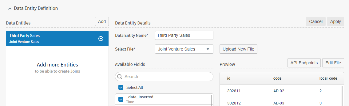 Select the data entity with the file you want to edit, then select API Endpoints. The API Endpoints work area opens.