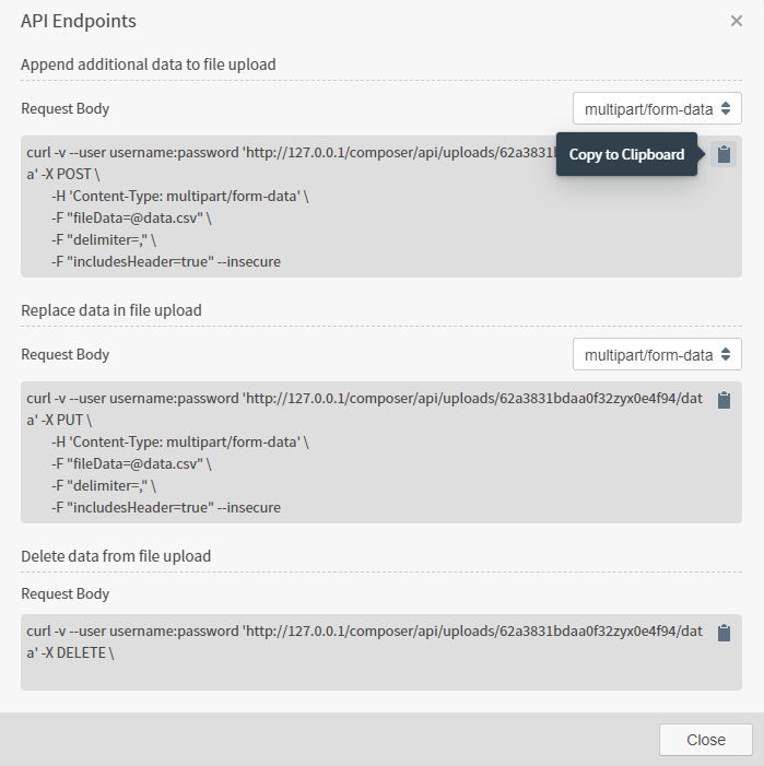Copy and modify the example cURL requests to include your own Composer credentials, replacing the placeholders for username and password. Select Close to close the dialog.