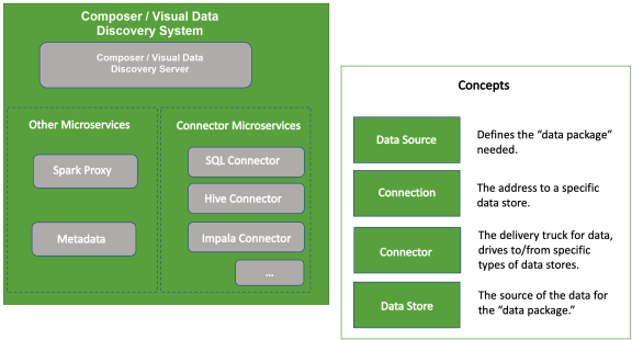 Composer connects to a wide array of data sources available in the marketplace today—from modern databases (including Hadoop, Search, Streaming, and NoSQL) to traditional sources like SQL-based stores. Composer comes prepackaged with connectors that are automatically installed during the Composer installation process.