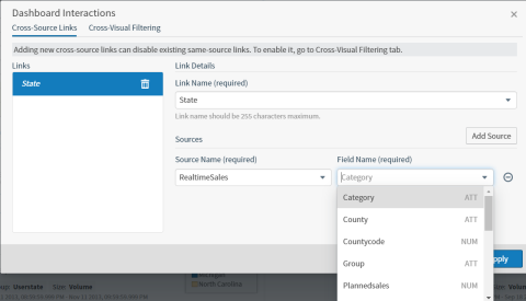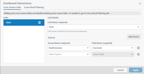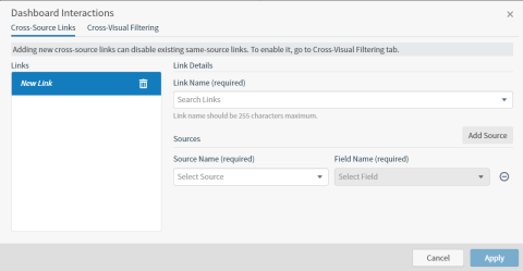 Cross-source links are defined on the Cross-Source Links tab of the Dashboard Interactions dialog. Each cross-source link on your dashboard must use unique sources and fields. There is a one-to-one relationship between cross-source link names and your data fields. You cannot create multiple cross-source links for the same data field. In addition, you cannot use the same cross-source link name for multiple data fields.