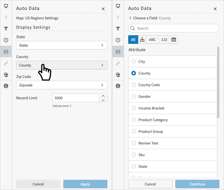 attribute variables are represented in the side panel as a button that users use to select a field. This variable’s selected field is not used as part of the data request by default, but the name is provided for other uses or for manual configuration within the visualization’s code.