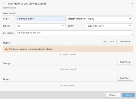 Select Add View. The New Materialized View (External) dialog appears. This dialog is used to identify where the aggregated result from a query is stored so it can be quickly recalled in visuals.