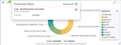 dashboard interaction icon on the visual. A drop-down dialog appears for the visual, listing all of the links resulting in published filters for the other visuals on the dashboard.