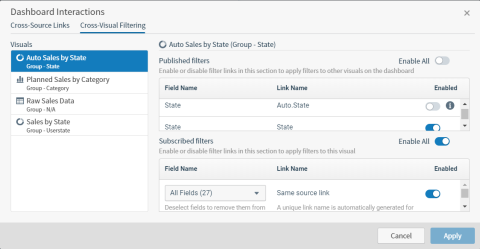 You can select cross-source and same-source links to which a visual on a dashboard should subscribe (use). When a visual subscribes to a link, the visual will be filtered by the link field if another visual creates a cross-visual filter for the same field.