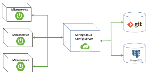 The Composer configuration microservice is packaged with the Spring Cloud Configuration server, which allows Composer to easily integrate with its Spring-based microservices and provides the mechanism by which Composerproperty settings can be persisted in a supported PostgreSQL metastore or in a GitHub repository. The following diagram depicts this relationship.
