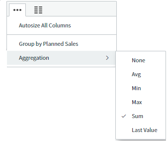 Shown only for numeric fields or metrics, this option allows you to change the aggregation method for the field. Valid options are AVG, MIN, MAX, SUM, NONE, or LAST VALUE. See Change Metric Aggregation in Tables. |