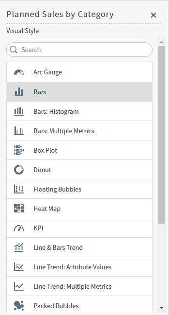 The Visual Style sidebar lets you quickly change the style of visual displayed in a dashboard visual or when you are editing a visual in the Visual Gallery. Controls for changing the style of a visual are provided using the interactivity sidebar. See Control How Users Interact With a Visual.