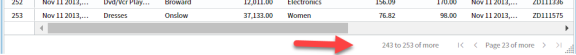 Note: If you use pagination, the number of pages of data available to display before more data is fetched from the data store is determined by the size of the visual widget on the dashboard. For example, if your Rows per Fetch setting is 250 rows, but your visual widget can only display 30 rows of data, only 30 rows of data are ever shown in the visual. This means that 8.33 pages (250/30) of data are available for viewing. When you page forward (using the forward arrows in the pagination bar) to the end of the fetched data, Composer automatically fetches another block of data (based on the Rows per Fetch setting) and fills out any partial page of data with newly fetched data to fill the 30 rows. Additional pages of data are added so you can view the rest of the newly fetched data.